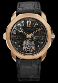 | + More characteristics : | Movement Modified BVL428 manufacture manual winding mechanical movement with openwork bridges, minute repeater, 3-hammer carillon, tourbillon and power reserve indicator Power reserve: 75 hours Frequency 21’600 VpH (3Hz) Case Satin-polished rose gold case Dial Sandblasted openworked dial in brass Strap / Buckles Black alligator strap with satin-polished rose gold folding buckle |