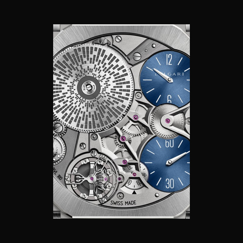 Consequently, the new Octo Finissimo Ultra Platinum is crafted in 950 platinum with satin, polished and sand-blasted finishes for the case middle and bezel, while the back/plate element is in tungsten carbide. The bracelet is also in platinum with a satin-polished finish. The integrated clasp is made of titanium to guarantee greater reliability (tested to 5000 cycles). Last but not least, this new model, equipped with the BVL 180 manufacture caliber, is a remarkable 1.80 mm thin, a first for a platinum watch.