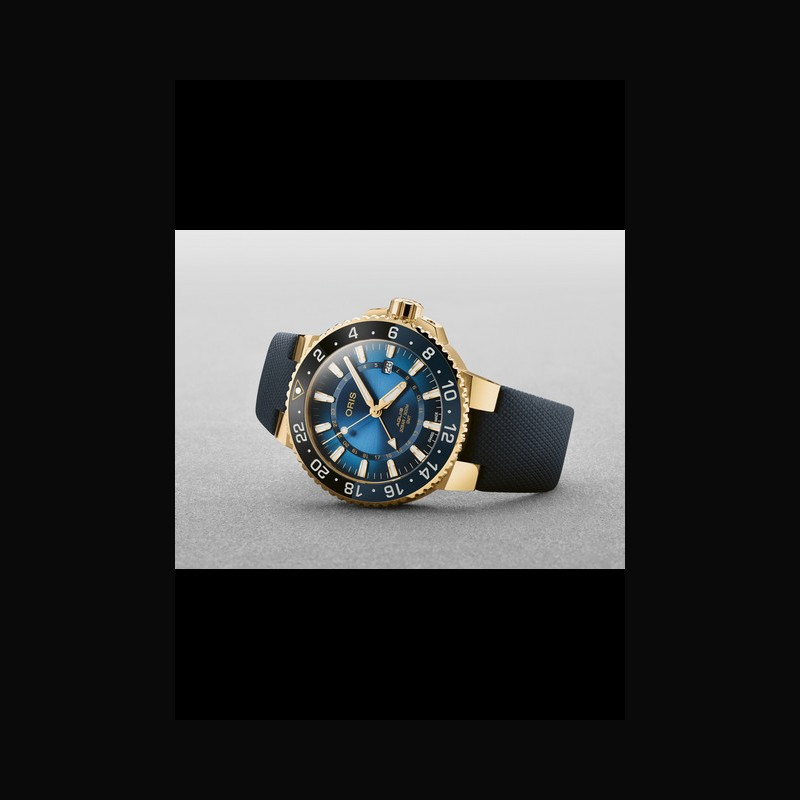 The Oris Carysfort Reef Limited Edition is the first Oris Aquis model produced in solid gold. The case is cast in 18-carat yellow gold, complemented by a solid 18-carat gold bezel with a black and blue ceramic insert. The automatic mechanical watch has a GMT function and can show the time in three time zones simultaneously using the 24-hour scale laser-engraved into the bezel.