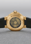 | Case peculiarity : | Bidirectional turning bezel Screwed-down caseback Screwed-down crown Bezel with black and blue ceramic insert and laser-engraved 24-hour scale Solid case back in 18-carat yellow gold with a sapphire crystal inlay printed with the limited edition number and a special Carysfort Reef motif Solid 18-carat yellow gold screw-in security crown |