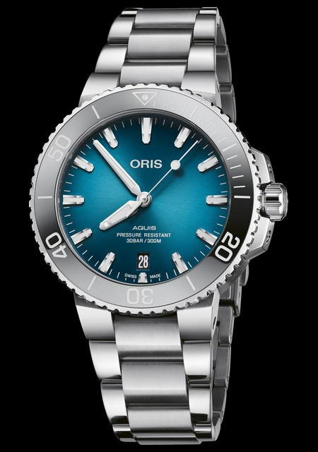 The Oris Aquis is a high-performance diver’s watch that delivers exceptional detail and functionality without compromising on style or value. This year, Oris is launching two new Aquis models, one with a new case size of 41.5mm made in response to Oris customer feedback; and a second with a new oceanic blue gradient dial that joins the collection of 39.5mm models. Both are waterresistant to 30 bar (300 m) and feature uni-directional rotating bezels for accurately and safely measuring dive times. Both are available on stainless steel metal bracelets enhanced by Oris’s clasp-extension system that can be quickly adjusted so the watch fits over a wetsuit. The larger model is also available on a rubber strap featuring Oris’s folding clasp system that protects the watch from falling off the wrist.