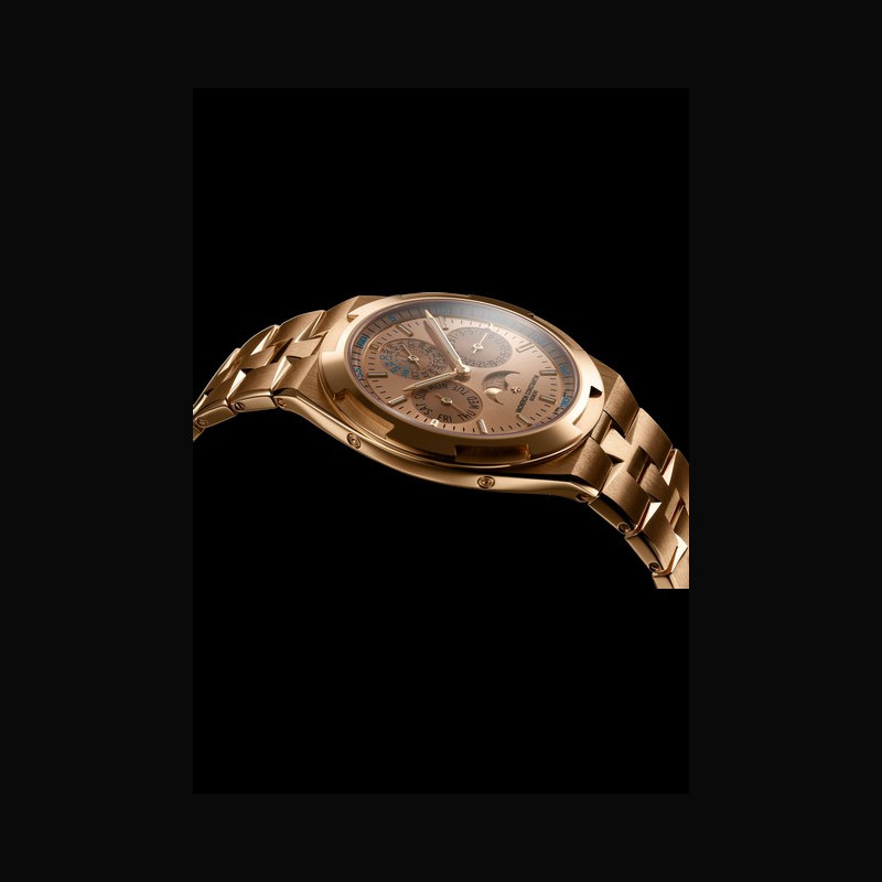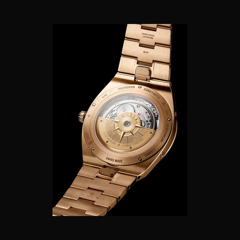 | More characteristics : | Movement Calibre 1120 QP/1 Developed and manufactured by Vacheron Constantin Mechanical, self-winding 22K gold Overseas oscillating weight 29.6 mm (12½’’’) diameter, 4.05 mm thick Approximately 40 hours of power reserve 2.75 Hz (19,800 vibrations per hour) 276 components 36 jewels Case 18K 5N pink gold Dial 18K 5N pink gold; golden-toned translucent lacquer Bracelet / Buckles 18K 5N pink gold (half Maltese cross-shaped polished and satin-brushed links), secured by a 18K 5N pink gold triple-blade folding clasp with push-pieces and comfort-adjustment system Second strap in dark blue rubber and a third strap in white rubber; delivered with an 18K 5N pink gold buckle with interchangeable system, compatible with both additional straps ‘Poinçon de Genève’ certified timepiece |