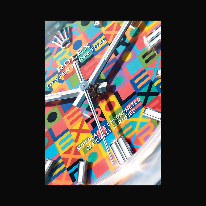 This dial offers a subtle yet thoroughly modern reinterpre- tation of the Jubilee motif introduced at the end of the 1970s, which became iconic. It displays the letters of the name ‘Rolex’ in a contrasting interplay of no fewer than ten colours. Executing this pattern presents a sizeable challenge, for the colours are applied not all at once, but one after the other. The utmost precision is also required to ensure that all the shapes and letters making up the motif are positioned perfectly, resulting in a dial that exudes panache.