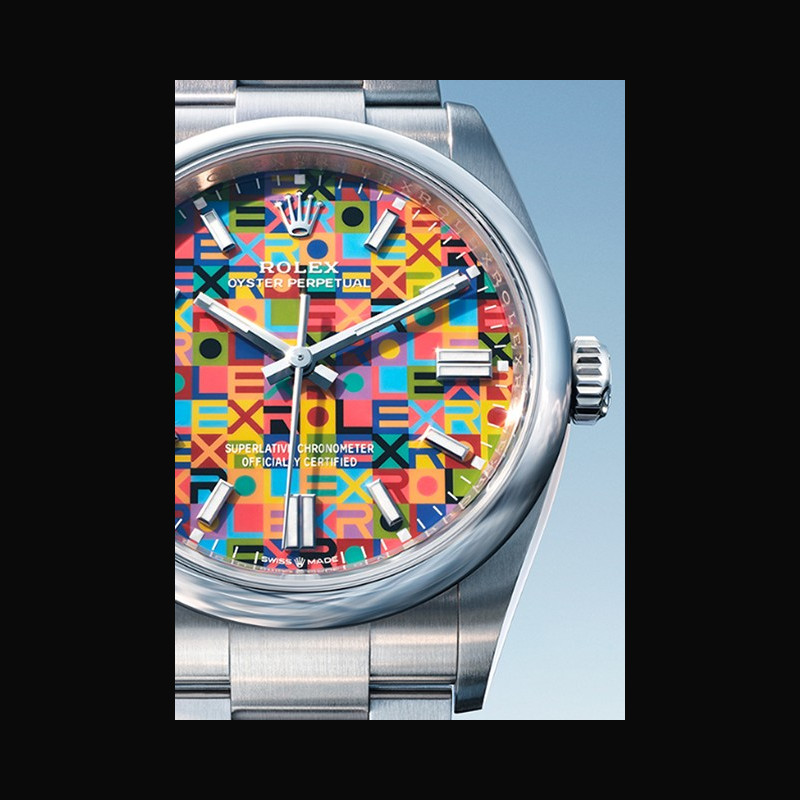 Watches in the Oyster Perpetual range are direct descendants of the original Oyster, the first waterproof wristwatch by Rolex, on which the brand has built its reputation since 1926. These time- pieces benefit from all the fundamental features of the Oyster Perpetual collection – chronometric precision, a waterproof Oyster case, and self-winding of the movement via a Perpetual rotor. Displaying hours, minutes and seconds, and featuring a sophisticated finish, they represent chronometer wristwatches in their purest form. Timeless in their essence, they are continually reinterpreted and have gradually been endowed with the brand’s technical innovations. The varied and constantly evolving colours and design of the dials ensure the Oyster Perpetual never loses its fresh and contemporary appeal.