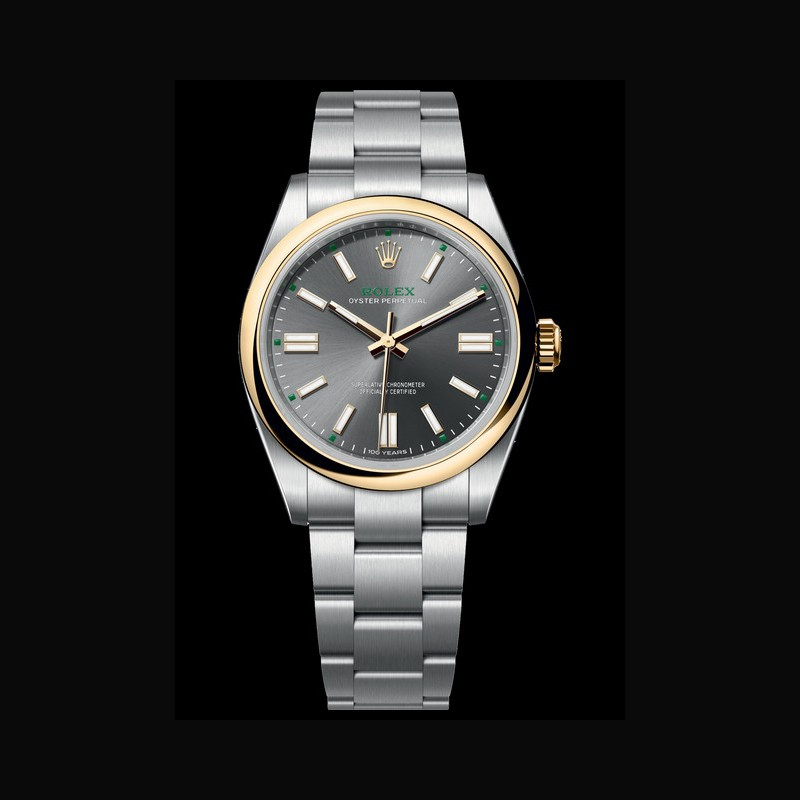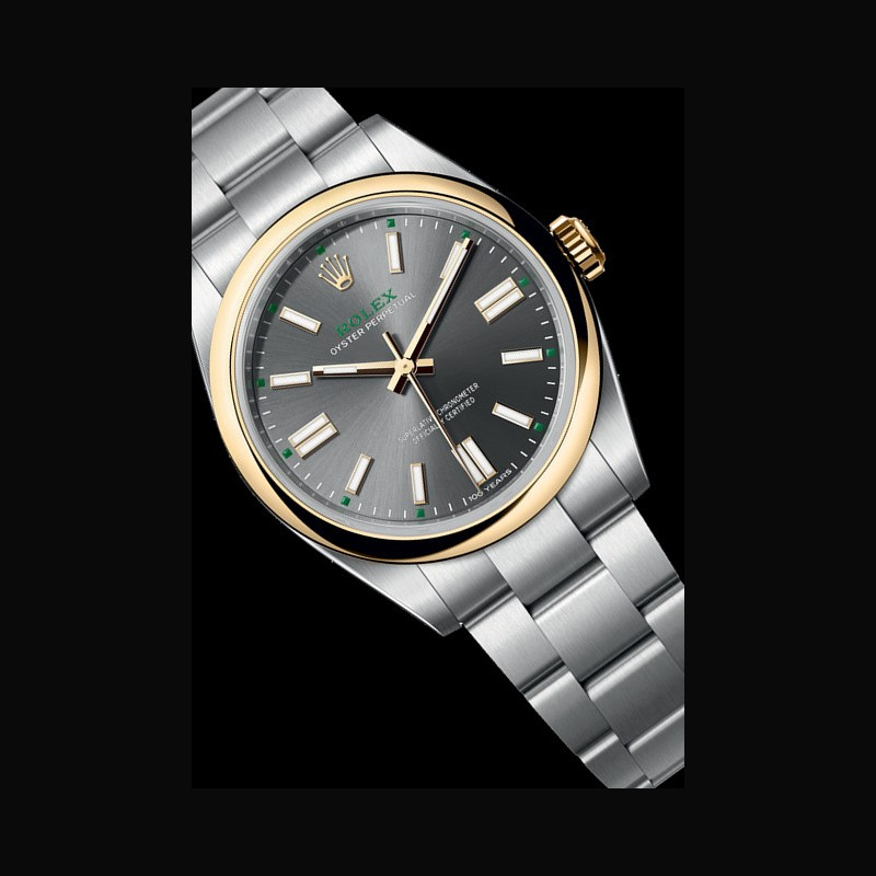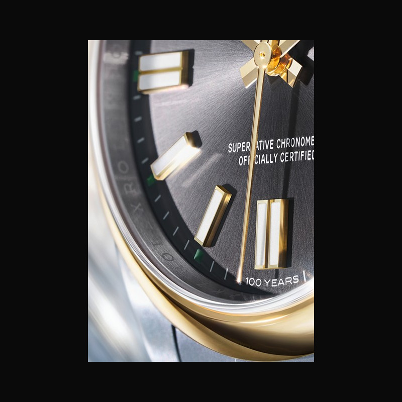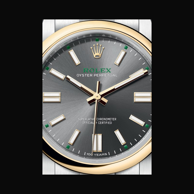 | More characteristics : | Movement - Calibre 3230, Manufacture Rolex - Mechanical movement with bidirectional self-winding via Perpetual rotor Precision - −2 /+2 sec./day, after casing Oscillator - Frequency: 28,800 beats/hour (4 Hz) - Paramagnetic blue Parachrom hairspring - Rolex overcoil - Large balance wheel with variable inertia - High-precision regulating via four gold Microstella nuts - Traversing balance bridge - High-performance Paraflex shock absorbers Escapement - Chronergy with optimized energy efficiency - Paramagnetic nickel-phosphorus pallet fork and escape wheel Jewelling - 31 rubies Power reserve - Approximately 70 hours Dial - Slate, gloss, sunray finish; ‘100 years’ inscription at 6 o’clock Bracelet / Buckles - Oyster, three-piece solid links - Oystersteel, satin finish with polished edges - Folding Oysterclasp in Oystersteel - Easylink comfort extension link (approx. 5 mm) Certification Superlative Chronometer (official chronometer certification + Rolex certification after casing) International five-year guarantee |