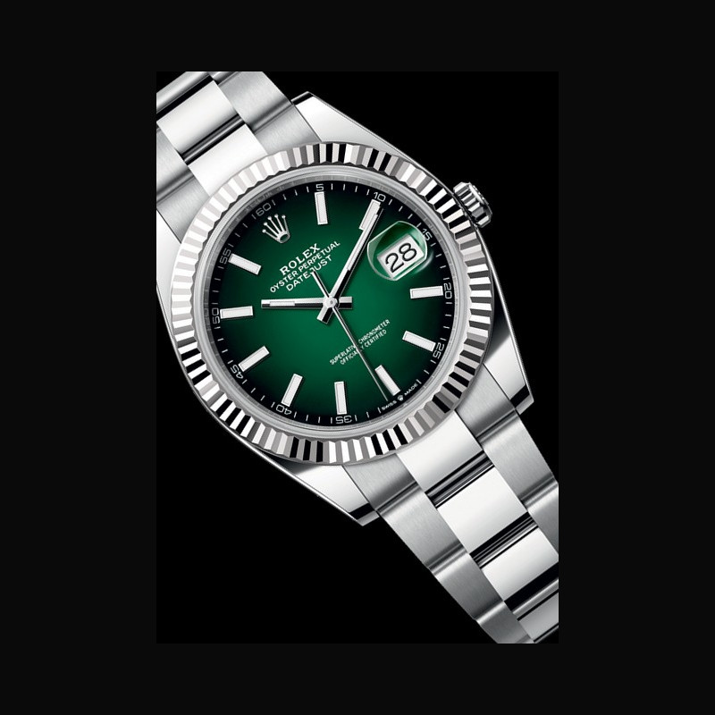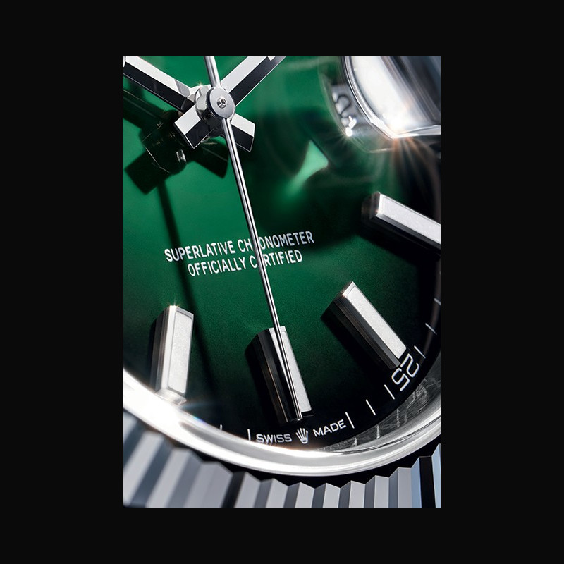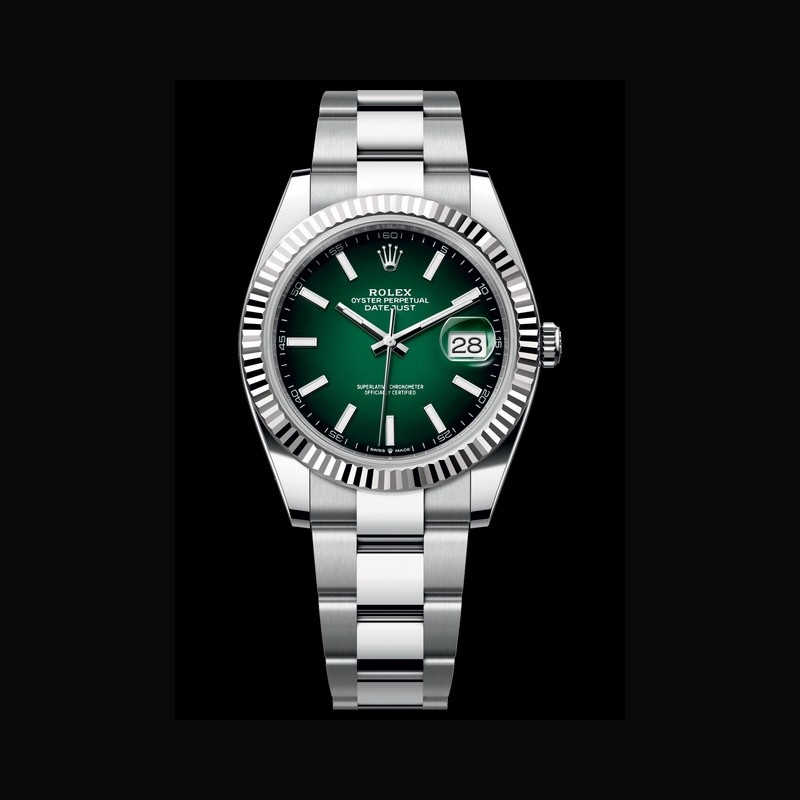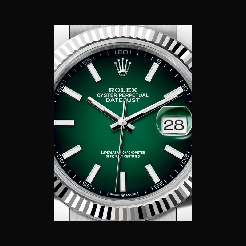 | More characteristics : | Movement - Calibre 3235, Manufacture Rolex - Mechanical movement with bidirectional self-winding via Perpetual rotor Precision - −2 /+2 sec./day, after casing Oscillator - Frequency: 28,800 beats/hour (4 Hz) - Paramagnetic blue Parachrom hairspring - Rolex overcoil - Large balance wheel with variable inertia - High-precision regulating via four gold Microstella nuts - Traversing balance bridge - High-performance Paraflex shock absorbers Escapement - Chronergy with optimized energy efficiency - Paramagnetic nickel-phosphorus pallet fork and escape wheel Jewelling - 31 rubies Power reserve - Approximately 70 hours Case - Oystersteel and white gold (white Rolesor) Dial - Green Lacquer Ombré Bracelet / Buckles - Oyster, three-piece solid links - Oystersteel, polished centre links, satin-finished outer links with polished edges - Folding Oysterclasp in Oystersteel - Easylink comfort extension link (approx. 5 mm) Certification Superlative Chronometer (official chronometer certification + Rolex certification after casing) International five-year guarantee |