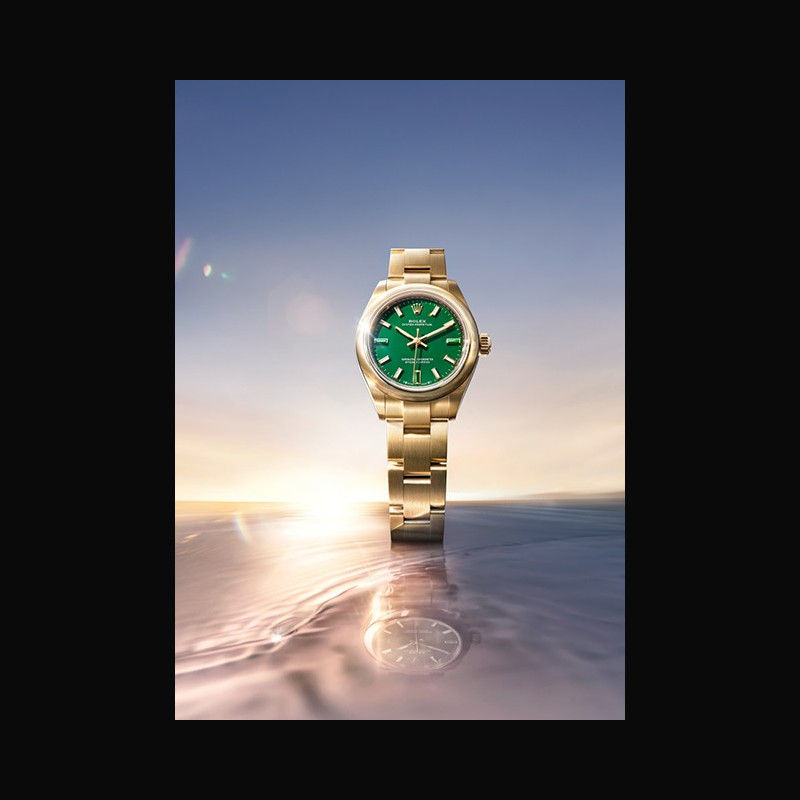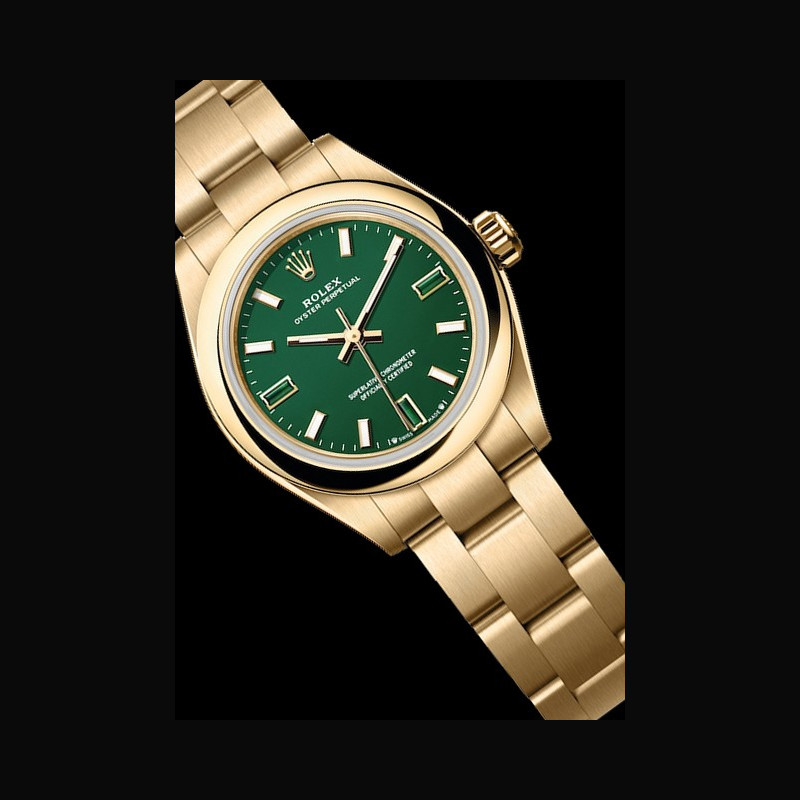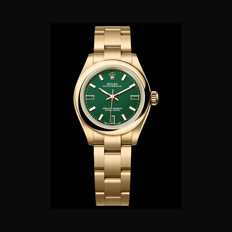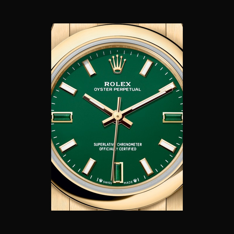 | More characteristics : | Movement Type Perpetual, mechanical, self-winding Calibre 2232, Manufacture Rolex Precision -2/+2 sec/day, after casing Oscillator Syloxi hairspring in silicon with patented geometry. High- performance Paraflex shock absorbers Winding Bidirectional self-winding via Perpetual rotor Power reserve Approximately 55 hours Case Yellow gold Dial Green stone Bracelet / Buckles Type Oyster, three-piece solid links Bracelet Material 18 ct yellow gold Clasp Folding Oysterclasp with Easylink 5 mm comfort extension link Certification Type Superlative Chronometer (official chronometer certification + Rolex certification after casing) |