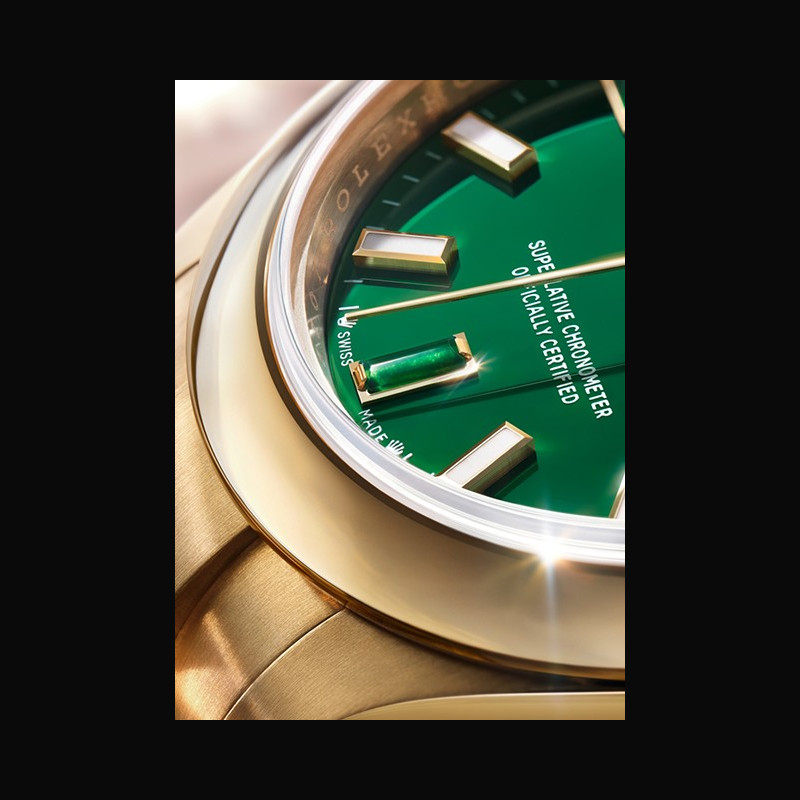 The Oyster Perpetual 28 in 18 ct yellow gold with a green stone dial and an Oyster bracelet.