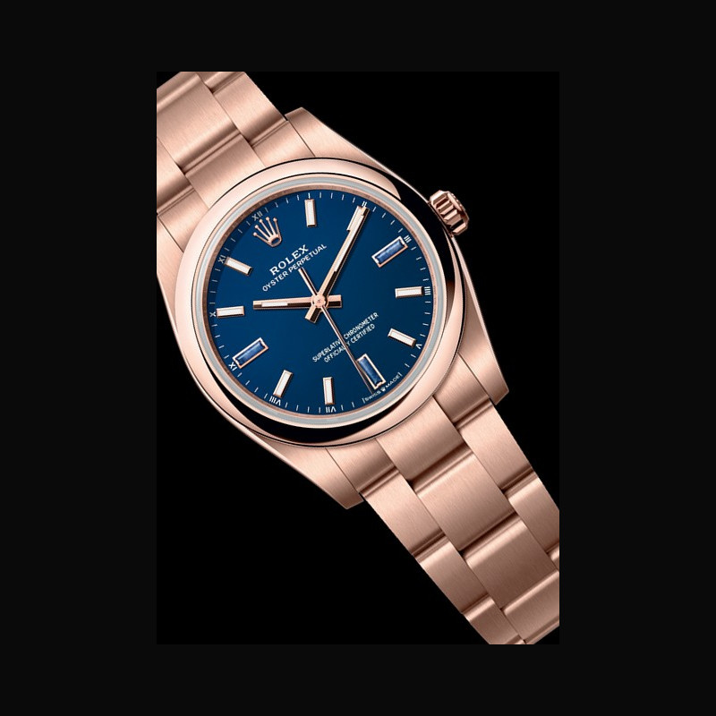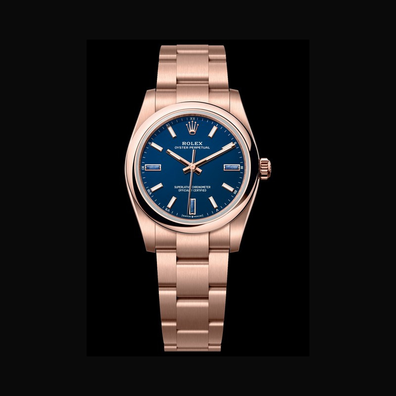 The Oyster Perpetual 34 in 18 ct Everose gold with a blue stone dial and an Oyster bracelet.