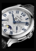 | More characteristics : | Case 41 mm. 316L Steel Polished case finish. case middle hoop polished/satin-finished with micro-blasted grooves Case-back secured by 6 screws with polished heads Dial Silvered. facetted dual window Guilloché on central zone and inside the complications Small second and power reserve indications on fine snailed background Blued 2N gilt horizontal moon phase Blued steel applique antique Arabic numeral chapter ring and Lys logo Pequignet marked blued steel hands Strap Large-scaled black alligator strap. beaded Ardillon buckle with relief Lys logo |