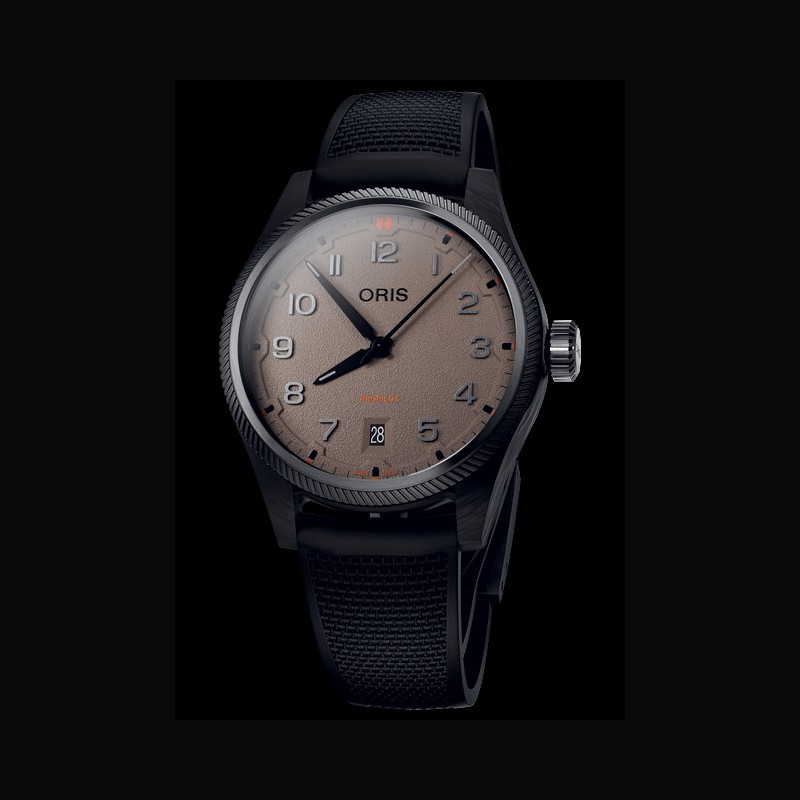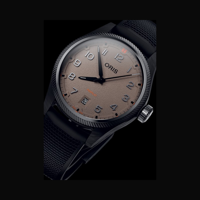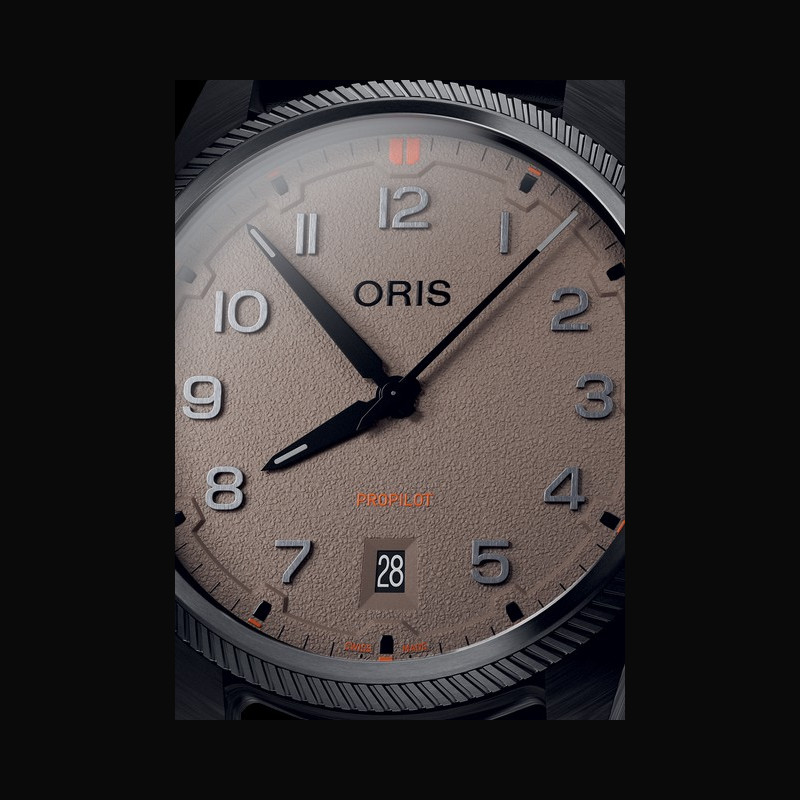 At Dubai Watch Week, it’s our great pleasure to introduce the ProPilot Desert Edition, a special version of the freshly updated ProPilot Date, one of our most loved contemporary aviation-themed designs. The new ProPilot Date’s case has been gently reshaped so it has a more pronounced silhouette with clean, visually sharp lines, while the dial ring, applied numerals and slimmed-down hands have all been reworked to feel more modern and dynamic. For this Desert Edition, the 41.00 mm case has been formed in a lightweight carbon fibre, produced using an innovative additive manufacturing and moulding technique pioneered in watchmaking by Oris engineers. This sits on a black hybrid rubber and textile strap with a new expression of the ProPilot Date’s famous ‘LIFT’ clasp that has now been redesigned to offer greater refinement and step- less adjustment. Together, these elements combine to deliver first-class ergonomics and usability, even in hot, arid conditions. The crown, oversized bezel and case back are in stainless steel and finished with a grey PVD coating that matches the colour of the carbon fibre case middle and lugs. The watch also has a grained ‘sandbeige’ dial inspired by the colour and texture of the desert, while high-contrast black hands and numerals ensure superb legibility. Punchy red detailing speaks to the watch’s adventurous profile. Every detail in the ProPilot Desert Edition has been chosen to deliver enhanced wearability and performance.
