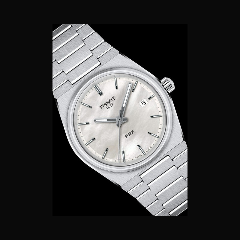 For smaller wrists, Tissot offers two new alternatives of the 35mm quartz version. One features a mother-of-pearl dial that showcases nature's wonder with its organic pearly shine for individuals who seek a discreet dash of glamour. Additionally, the brushed pink dial exudes a fresh modernity with the contemporary vintage aesthetic of the PRX collection.