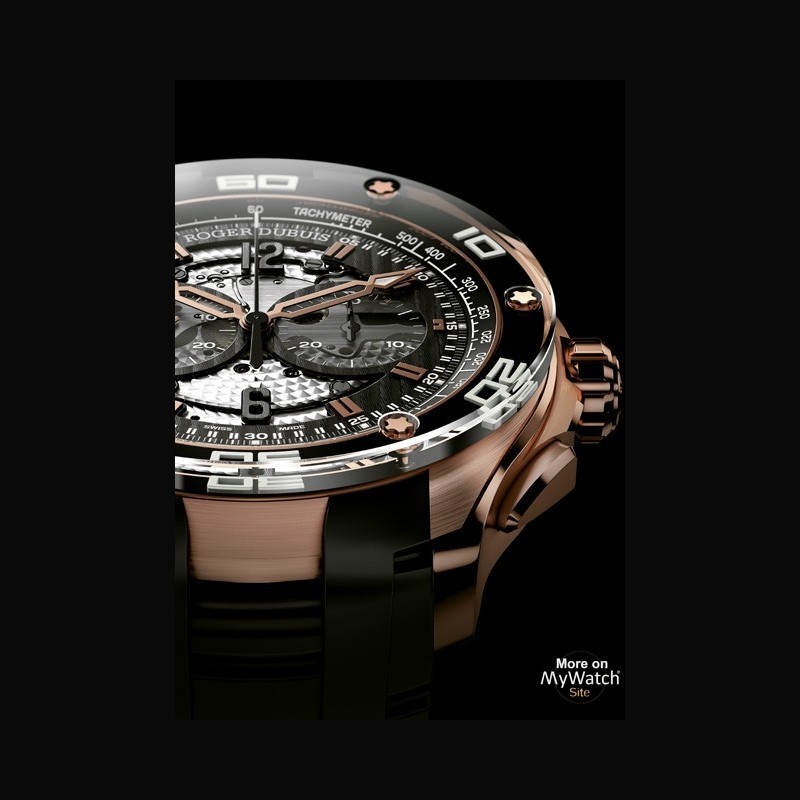 | More characteristics : | Double - pusher column - wheel chronograph Selfwinding mechanical movement with micro-rotor 13¾’’’ 42 jewels Finely adjusted in five positions rhodium - plated “Côtes de Genève” decoration Number of parts: 261 Height: 6.30 mm Frequency: 4 Hz (28.800 vph) Power reserve: 52 hours Dial Open on the movement Rhodium-plated arabic numerals at 12 and 6 o’clock integrated into the movement. “Côtes de Genève” pattern Black transfers White gold filet Silver exterior motifs “Côtes de Genève” Pink gold index appliques White ROGER DUBUIS and minute - circle transfers White SLN on the chronograph minute - circle White flange White tachymeter transfers Strap Alternance of satin and polish finishes Pink gold adjustable folding buckle |