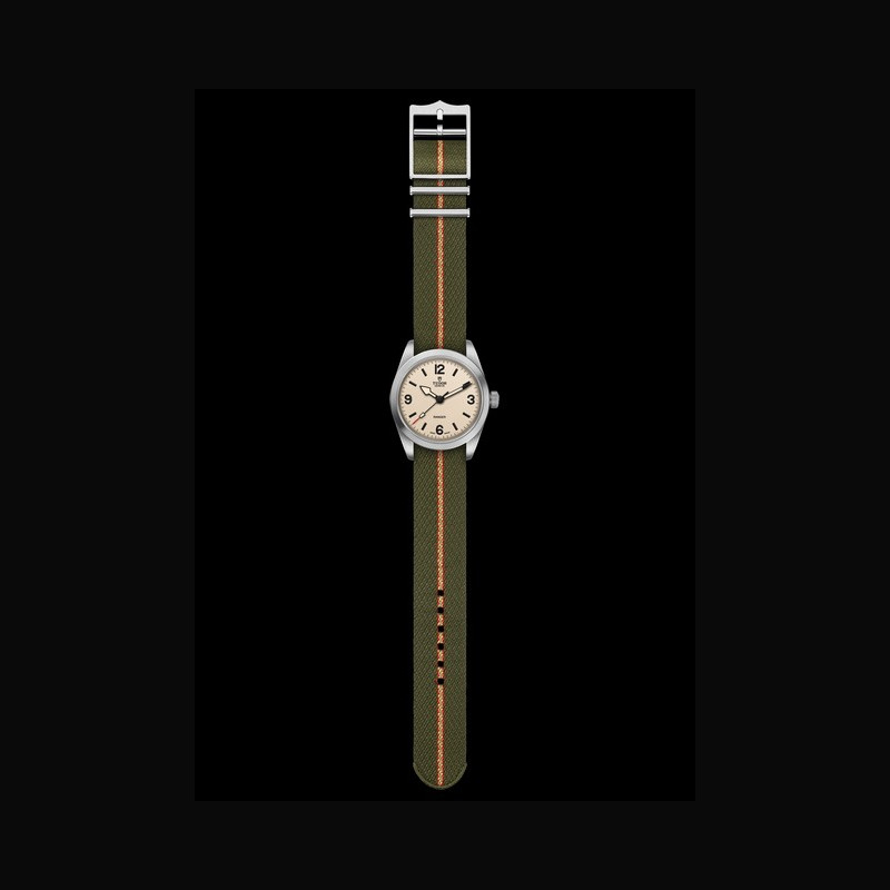 Also offered as a configuration with all Ranger models is a single-piece earth tone tri-colour fabric strap. Woven in France on 19th century Jacquard looms by the Julien Faure company in the Saint-Étienne region, its manufacturing quality, robustness and comfort on the wrist are unique.