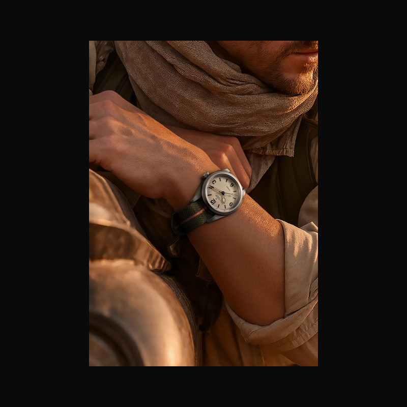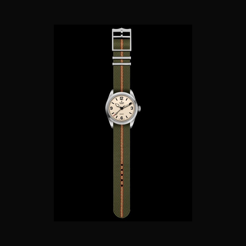 Also offered as a configuration with all Ranger models is a single-piece earth tone tri-colour fabric strap. Woven in France on 19th century Jacquard looms by the Julien Faure company in the Saint-Étienne region, its manufacturing quality, robustness and comfort on the wrist are unique.
