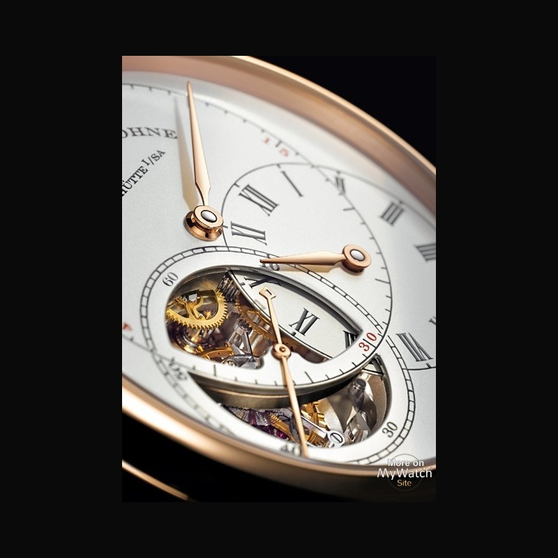 | More characteristics : | Regulator watch One-minute tourbillon with patented stop seconds Fusée-and-chain transmission Mouvement Diameter: 33.6 mm Height: 7.6 mm Largely decorated and assembled by hand Precision-adjusted in five positions Three-quarter plate made of untreated German silver Fourth-wheel bridge engraved by hand 351 components (+ 636 chain parts) 32 jewels. of which one diamond endstone Lever escapement Shock-resistant glucydur screw balance Superior-quality balance spring manufactured in-house Frequency: 21.600 semi-oscillations per hour Power reserve: 36 hours Dial Solid silver. argenté Pivoting dial segment Hand-stitched crocodile strap Lange deployant buckle in solid pink gold |