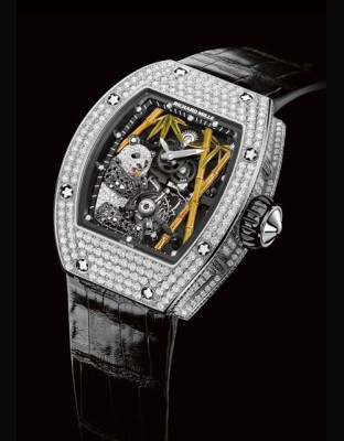 | More characteristics : | MOVEMENT Power Reserve : Circa 48 hours (±10%) This function is displayed using a newly designed differential power reserve system. with a printed red line on a moving disc located between 10 and 11 o’clock Spline screws in grade 5 titanium for the bridges Movement dimensions: 30.20 mm x 28.60 mm Thickness: 4.97 mm Tourbillon diameter: 12.30 mm Balance wheel diameter: 9.12 mm Number of jewels: 21 Balance: Glucydur. 2 arms. 4 setting screws. inertia moment 10 mg.cm2. angle of lift 53º Frequency: 21.600 vph (3 Hz) Balance spring: ELINVAR by Nivarox® Shock protection: KIF Elastor KE 160 B28 Stone setting in white gold Barrel shaft in nickel-free Chronifer (DIN x 46 Cr 13 + S) with the following characteristics: stainless- antimagnetic-suitable for tempering Free sprung balance with variable inertia Barrel pawl with progressive recoil CASE The tripartite case is water resistant to 50 meters. ensured by two Nitril O-ring seals. The case is assembled with 12 spline screws in grade 5 titanium and abrasion resistant washers in 316L stainless steel Upper flange in black carbon fiber. with the hours index set with diamonds Lower flange in black carbon fiber. with the minutes index in white color |