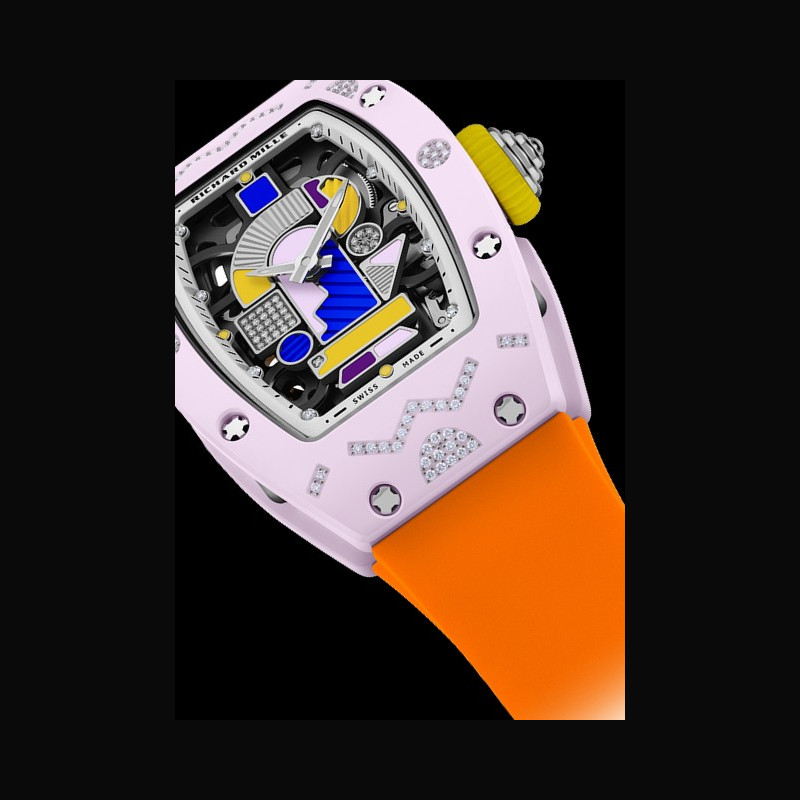 Every reflection emanating from the new RM 07-01 Coloured Ceramics awakens the memory, brilliantly sealing the creativity of an object that has become truly symbolic. The dials radiate, textures come to life, and colours vibrate as the world undergoes a metamorphosis: the shades compose a dreamlike universe where technical mastery diffracts the ordinary. The diamond, placed upon the material like an eternal snowflake, immortalises this moment.