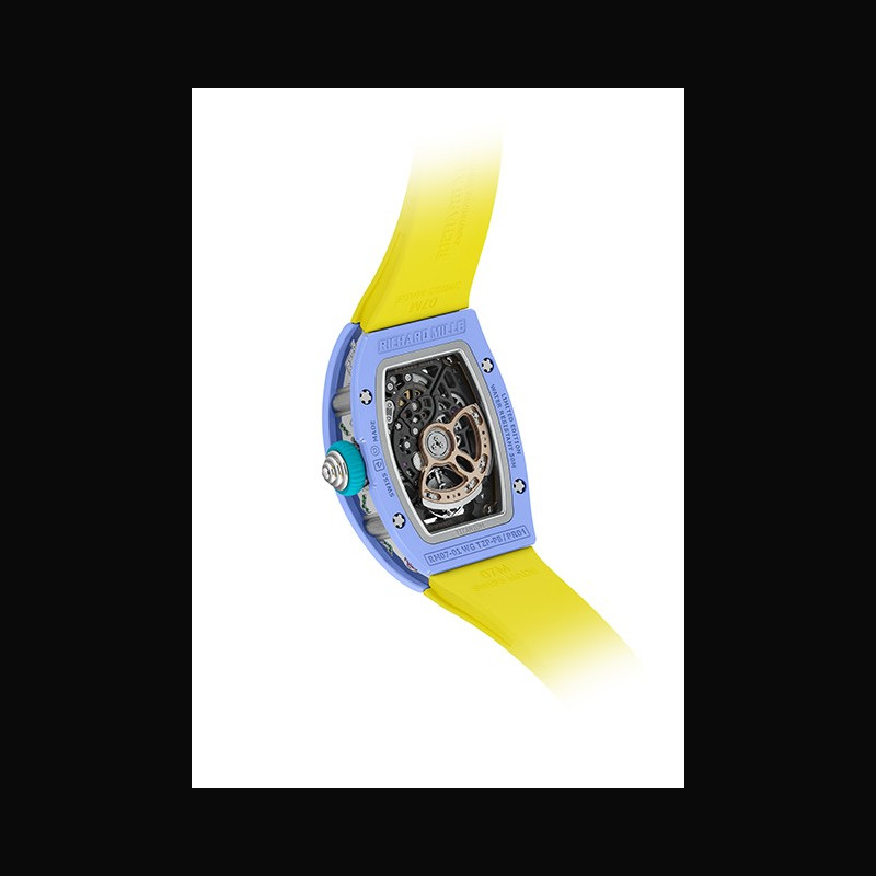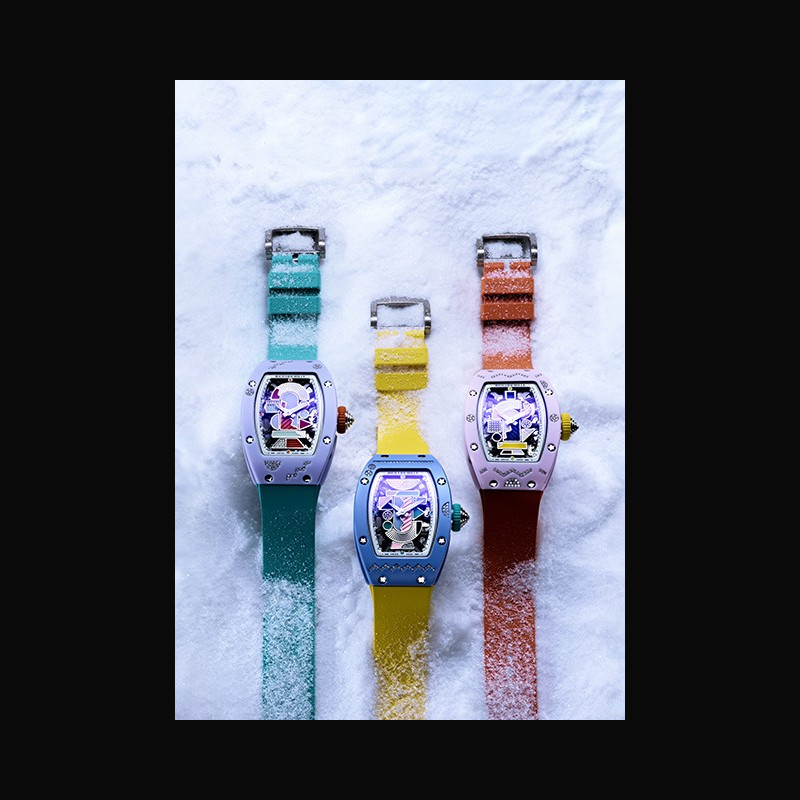 Every reflection emanating from the new RM 07-01 Coloured Ceramics awakens the memory, brilliantly sealing the creativity of an object that has become truly symbolic. The dials radiate, textures come to life, and colours vibrate as the world undergoes a metamorphosis: the shades compose a dreamlike universe where technical mastery diffracts the ordinary. The diamond, placed upon the material like an eternal snowflake, immortalises this moment.