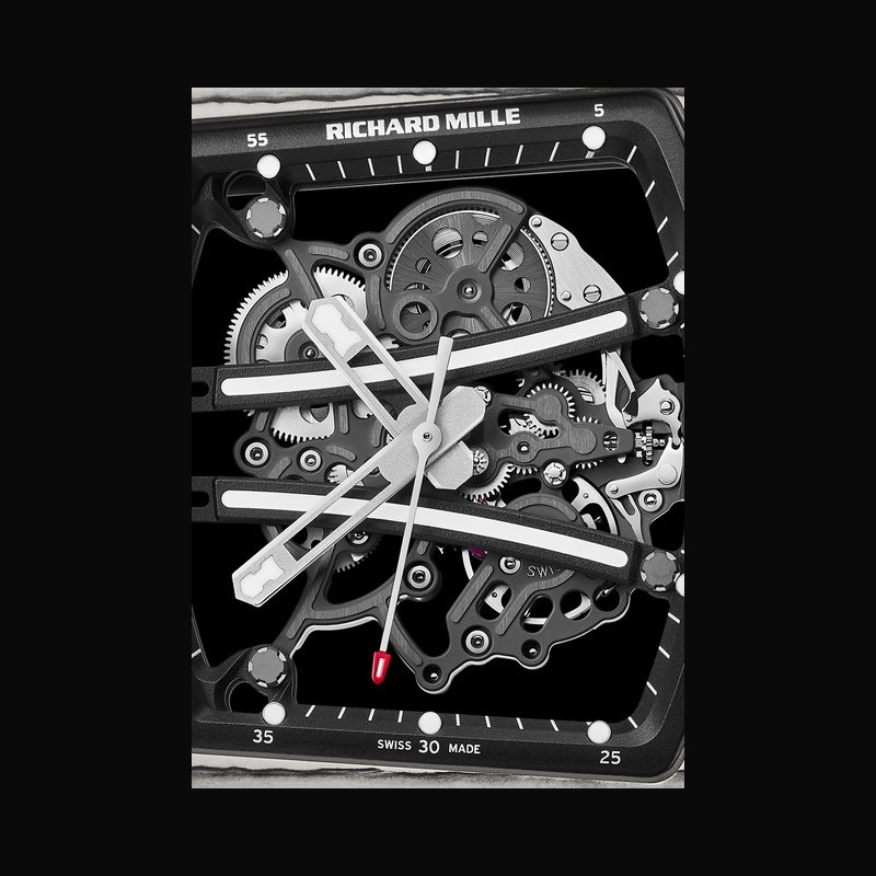 Boasting a highly skeletonised calibre crafted of PVD-treated grade 5 titanium, traversing balance bridges in black-galvanised and hand-painted grade 5 titanium and a balance wheel with variable inertia oscillating at a frequency of 4 Hz, the RM 61-01 ensures superlative performance thanks to a 55-hour power reserve and impact resistance tested for impacts of over 5,000 g’s.