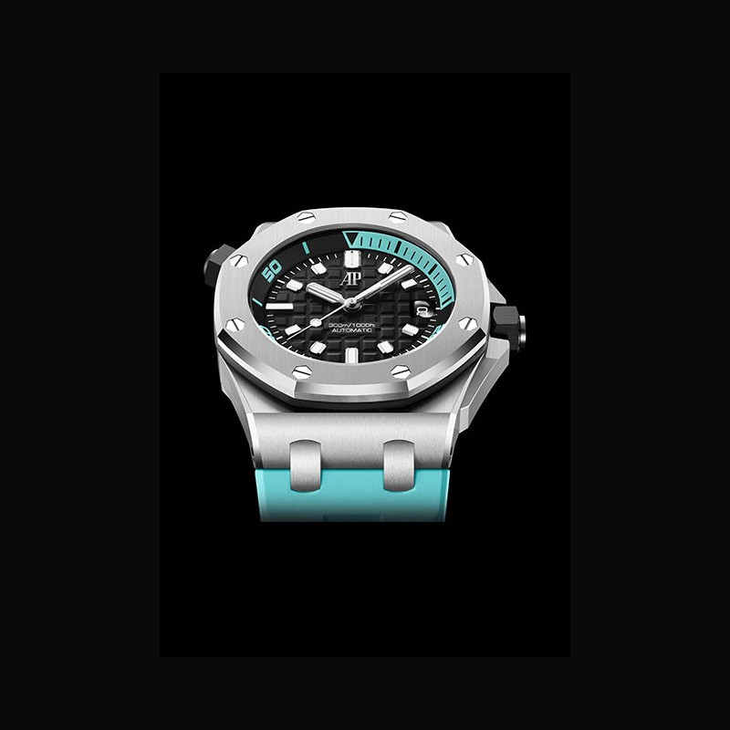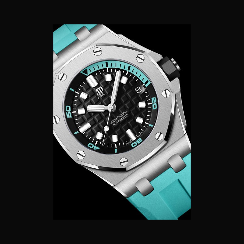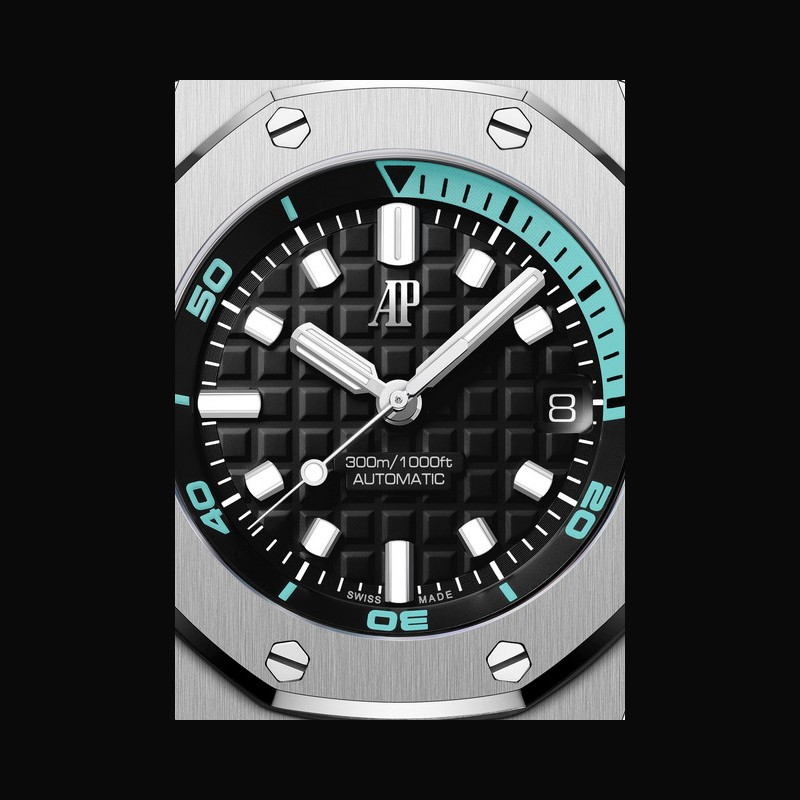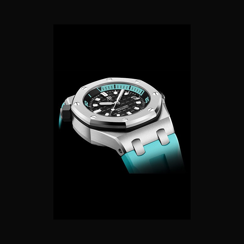 Two references showcase a black dial with a Méga Tapisserie pattern, enhanced by a luminescent 0–15-minute zone in either pink or turquoise, echoing the numerals on the inner bezel. The 18-carat gold hands and hour-markers are coated in luminescent material for optimal legibility, even in deep waters. The pink-accented model (ref. 15720ST.OO.A010CA.01) comes with a white strap, while the turquoise edition (ref. 15720ST.OO.A355CA.01) is paired with a matching strap. The third variation (ref. 15720ST.OO.A403CA.01) offers a deep teal Méga Tapisserie dial, contrasted by luminescent hands and hour markers in 18-carat pink gold and a white luminescent 0–15-minute zone on the diving scale. Touches of pink gold on the crown as well as the interchangeable rubber strap echo the dial, reinforcing the colour aesthetic. All three models feature the date window at 3 o’clock.