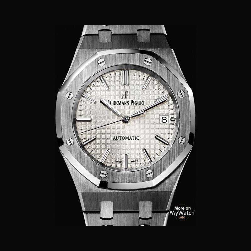This 37 mm-diameter Royal Oak Selfwinding model is also available in various steel or pink gold versions with a plain or gemset bezel, a black or silver-toned dial, and fitted with a leather strap or a steel or pink gold bracelet.