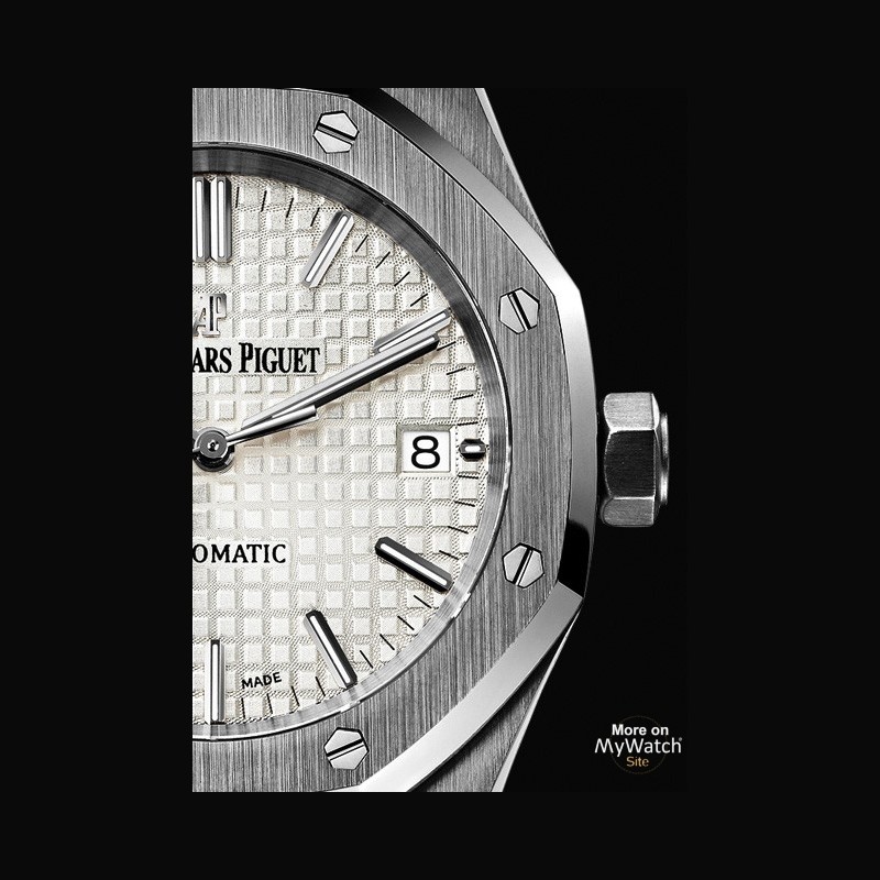 Also typical of this collection, the silver-toned dial of this Royal Oak bears a “Grande Tapisserie” pattern that now becomes a signature for all Royal Oak selfwinding models. This motif is crafted by Audemars Piguet using historical machines according to the ramolayé or pounced ornament technique. This process enables simultaneous cutting of squares interspersed with a gridwork motif of fine grooves. The superimposition of two decorations, which is a unique feature of Royal Oak dials, endows them with incomparable radiance. The discreet applied AP initials appear just above the logo, leaving space at 12 o’clock for a double hour-marker inspired by the first Royal Oak watches launched in 1972.