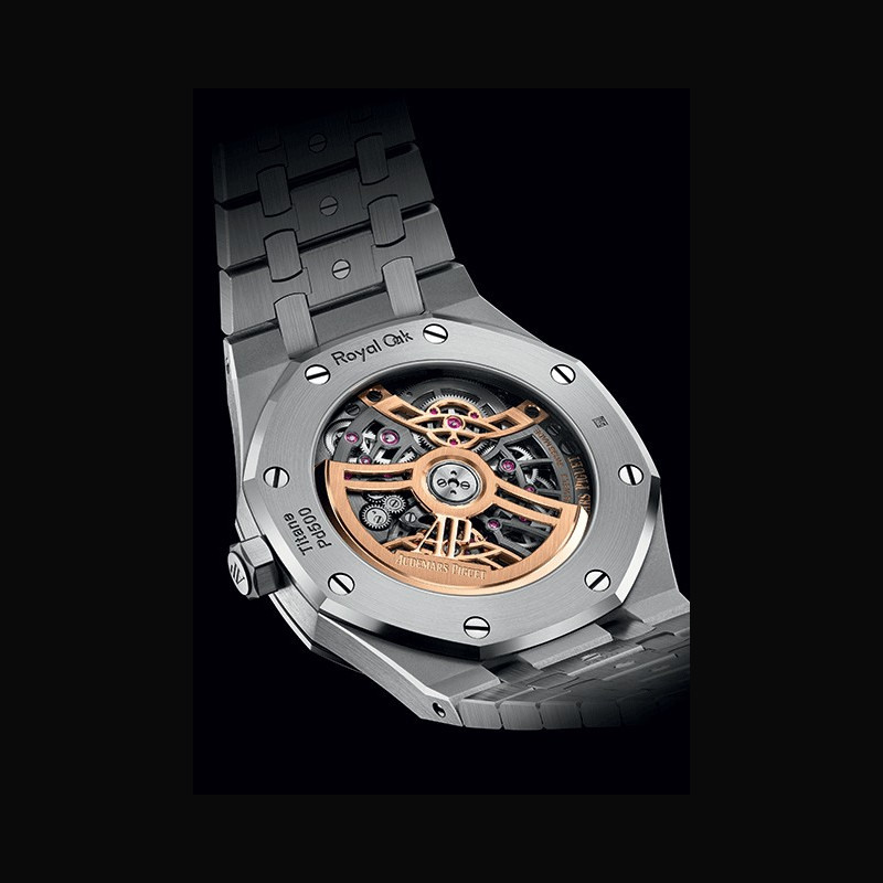 The new 41 mm Royal Oak model unites titanium and precious Bulk Metallic Glass (BMG) for a unique combination of lightness and resistance. First discovered in the 1960s, BMGs are metallic alloys that, when rapidly cooled, take on properties similar to glass, such as high strength and an amorphous structure. Composed of over 50% palladium, Audemars Piguet’s proprietary BMG is highly resistant to wear and corrosion and has a distinctive reflective sheen. The bezel, caseback and bracelet studs are crafted from this precious material and finished with a mirror polish that brings out its natural brilliance. In contrast, the case, crown and bracelet links are honed from titanium and feature the Manufacture’s signature satin finish. This alternation of polishing and satin brushing creates a rich interplay of light, while highlighting the Royal Oak’s complex architecture.