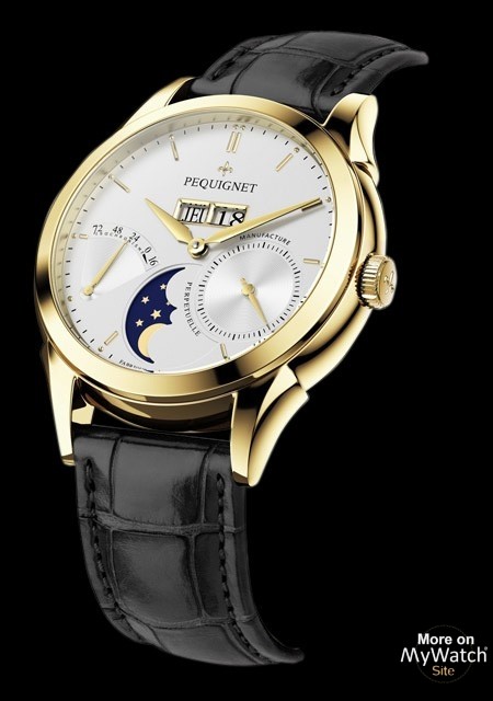 | More characteristics : | Movement Dual direction automatic winding Frequency: 21.600 vibrations per hour (3 Hz) Large date and day with no amplitude loss upon activation Unique system for exceptional reliability and accuracy. integrated complication 100-hour power reserve design. set to 88 hours. dial display with 72-hour guaranteed isochronism. integrated complication Large accurate moon phase at 6 o'clock. integrated complication Small seconds at 4 o'clock symmetrical to power reserve Movement finish: Bridges and main plate circular-grained and snailed. with Côtes de Genève Oscillating weight with sunray finish and rhodium plating. gilt Fleur-de-Lys logo Case 3N18 yellow gold Polished steel finish Case-back secured by 6 screws with polished heads Dial Chapter ring and logo in 3N18 yellow gold applique Recessed Power Reserve and Moon Phase Fine snailed small seconds Double window in 3N18 yellow gold applique Strap Large-scaled alligator strap Beaded Ardillon buckle with Fleur-de-Lys in relief |