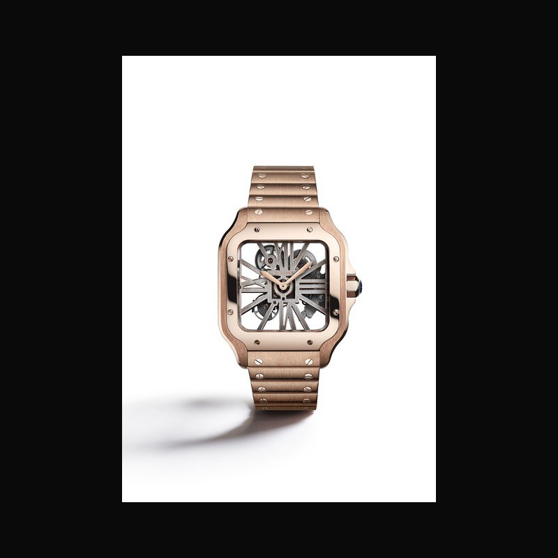 The Santos Skeleton watch introduces solid gold and solid steel bracelets with self-fitting links for the first time in Cartier Fine Watchmaking.