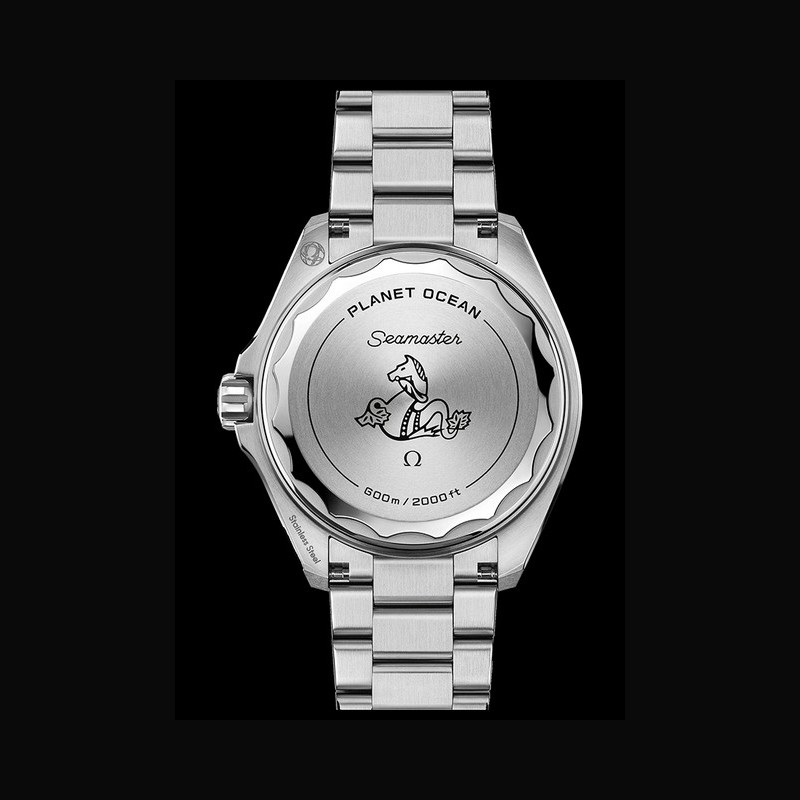 The caseback design features a waved edge, along with PLANET OCEAN and SEAMASTER engravings, a mention of the water-resistance, and the iconic OMEGA Seahorse emblem engraved at the centre.
