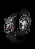 | More characteristics : | Movement Manual-winding MB&F in-house movement Hours on left dome (aluminium dome rotating in 12 hours) Minutes on right dome (aluminium dome rotating in 60 minutes) Power reserve indicator at the back of the movement thanks to dedicated hand and a metallization on the case back sapphire crystal Case Black PVD-coated stainless steel case with red domes Strap / Buckles Hand-stitched black rubber strap with velcro system. Ardillon buckle in grade 5 titanium |