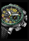 | + More characteristics : | Movement Calibre G1721. automatic bi-compax chronograph 28'800 A/h (4Hz) Incabloc shock absorber 28 jewels Power reserve: 48 hours Case Steel right hand control pushers with 'Clous de Paris' high grip pattern Screwed crown secured by an additional hexagonal bolt Black carbon bezel. Green rim with GMT Domed sapphire crystal. anti-reflective coating on both faces See-through sapphire crystal case back with limited edition serial number Dial Black carbon dial and seconds counter Black snailed minutes counter with green ring Black tachymeter scale on external ring White Super-LumiNova hands Yellow Super-LumiNova numerals Black GMT hand with white Super-LumiNova peak and red contour Strap Integrated black tyre tread rubber with yellow inset Available on steel bracelet |