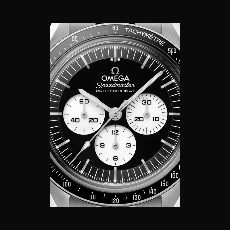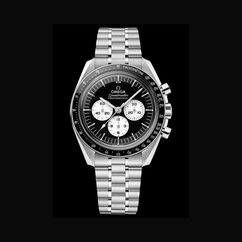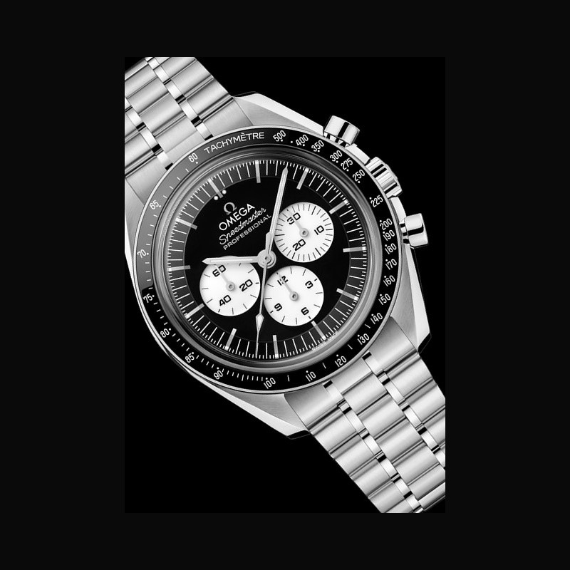 In combination with the black and white dial, the new watches include black ceramic bezel rings filled with a tachymeter scale in white enamel. The front features a box-form scratch-resistant sapphire crystal with an anti-reflective treatment. Around the wrist, the watches are distinguished by their polished-brushed bracelets, created in the standard Moonwatch style with OMEGA’s patented comfort release adjustment system.
