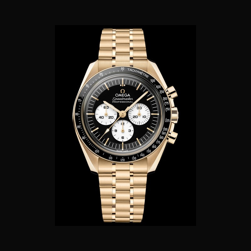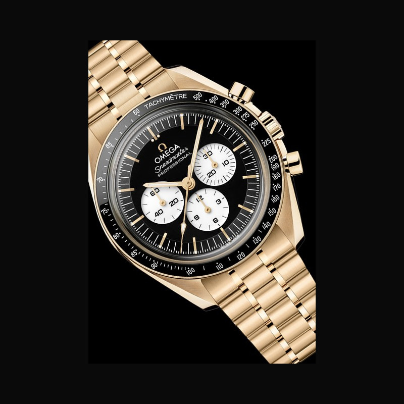 | More characteristics : | Movement Calibre: Omega 3861 Manual-winding chronograph movement with Co-Axial escapement Certified Master Chronometer, approved by METAS, resistant to magnetic fields reaching 15,000 gauss Free-sprung balance with silicon balance spring Rhodium-plated finish, bridges with straight Geneva waves Power reserve: 50 hours Anti-magnetic Case Or Moonshine™ Between lugs: 20 mm Lug to lug: 47.46 mm Dial Black Bracelet / Buckles Or Moonshine™ Foldover clasp with comfort setting |