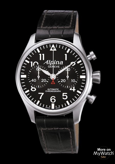 | + More characteristics : | Movement Power reserve 42 hours PVD Black coated Alpina rotor Case New round 2-part stainless steel case Dial Large white luminous numerals White luminous hands with Alpina red triangle signature on the second’s hand Strap Black leather strap with new stainless steel folding buckle |