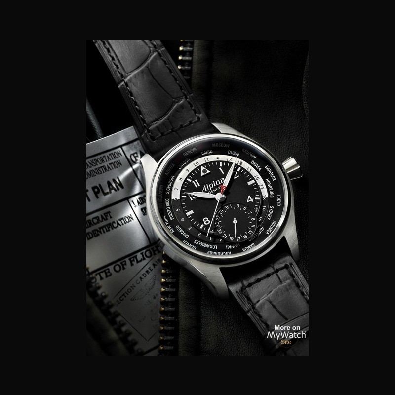 | + More characteristics : | Movement AL-718 Manufacture caliber Automatic with date by hand adjustable by the crown. and worldtimer function. adjustable with the crown Perlage & Circular Côtes de Genève decoration on the movement PVD Black coated Alpina rotor 26 jewels 42-hour power reserve Dial Date counter at 6 o’clock 24H disc. with day-night indication City disc with 24 cities Strap Black crococalf strap Water-resistant inner lining Stainless steel folding buckle |