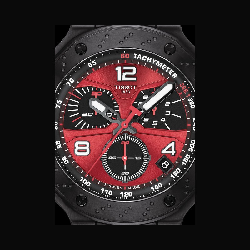Complementing the automatic edition, the T-Race MotoGP Quartz Chronograph Limited Edition brings its own dynamic interpretation of high-speed performance. Its assertive 45mm black case with an anti-reflective coating enhances legibility, drawing attention to a striking red dial highlighted by Super-LumiNova® details. The design features sharp contrasts and purposeful lines that evoke the motion and tension of competitive racing.