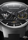 | More characteristics : | Movement Movement LV 82 Calibre: mechanical movement with automatic winding developed and assembled by La Fabrique du Temps Louis Vuitton Flying tourbillon at 9 o’clock - tourbillon carriage in “V” shape (inspired by Gaston Vuitton) which performs a complete rotation in one minute GMT at 3 o’clock – LV shape hand 201 components 65 hours of power reserve 28,800 oscillations per hour 29 jewels Case Titanium case, titanium horns and pushers, titanium and black rubber crown Dial Black dial base with sunray finish, topped by a black perforated grid with microblasted finish Polished black PDV indexes with massive blocks of Super-LumiNova® Strap Black rubber strap Titanium double folding buckle Box Watchmaking Trunk |