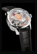 | More characteristics : | 24 Second Inclined Tourbillon Movement 370 parts 42 jewels Olive-domed jewels in gold chatons Tourbillon cage : 87 parts Weight of the cage : 0.39 g Rapid rotating twin barrels equipped with a slipping spring to avoid excessive tension Variable-inertia balance wheel with gold mean-time screws Frequency : 21 600 vibrations/hour Power reserve : 72 hours Balance spring : Phillips terminal curve and Geneva-style studMain plates in Nickel silver Bridges in Nickel silver 'Message from the Inventors Watchmakers' relief engraved on gold plates Gearing : Involute circle profile and tangential inclined gear with profiled teeth. on fixed wheel and escape wheel pinion Cage pillars in Avional Titanium cage bridges Gold counterweight Case Lateral window with shaped sapphire crystal Gold security screws Hand-engraved individual number Crown in gold with engraved and black lacquered GF logo 24 hour display Small seconds in flame-blued polished steel Hand-sewn strap Folding clasp engraved with the Greubel Forsey logo |