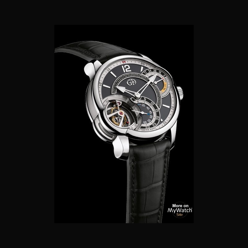 | More characteristics : | 24-Second Tourbillon 24-second Tourbillon rotation indicator Movement 280 parts Tourbillon cage : Inclined at a 25° angle 88 parts Weight of the cage : 0.39 g36 jewels Olive-domed jewels in gold chatons Power reserve : 72 hours Rapid rotating twin barrels equipped with a slipping spring to avoid excessive tension Variable-inertia balance wheel with gold mean-time screws Frequency : 21 600 vibrations / hour Balance spring : Phillips terminal curve and Geneva-style stud Main plates in Nickel silver Nickel-silver 'Greubel Forsey' gold nameplate Steel black mirror-polished and beveled Tourbillon bridge Gearing : Involute circle profile and tangential inclined gear with profiled teeth. on fixed wheel and escape wheel pinion Cage pillars in Avional Titanium cage bridges Gold counterweight Case Lateral window with shaped sapphire crystal Gold security screws Hand-engraved individual number Crown with engraved and black lacquered GF logo Hand-sewn strap Folding clasp engraved with the Greubel Forsey logo |