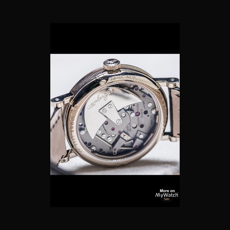 | + More characteristics : | Mouvement Numéroté et signé BREGUET Cal. 505SR1 14½ lignes 38 rubis Réserve de marche de 50 heures Échappement à ancre en ligne inversée avec cornes en silicium Spiral BREGUET en silicium Fréquence : 3.0 Hz Ajusté dans 6 positions Boîtier Attaches soudées. barrettes vissées Cadran en or 18 carats argenté et guilloché à la main. excentré à 12h Individuellement numéroté et signé BREGUET Indication de la petite seconde rétrograde à 10h Disponible également en or rose 18 carats : Référence 7097BR/G1/9WU |