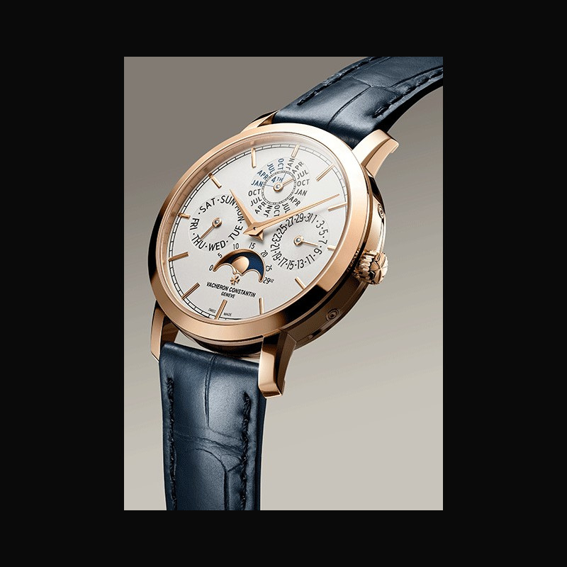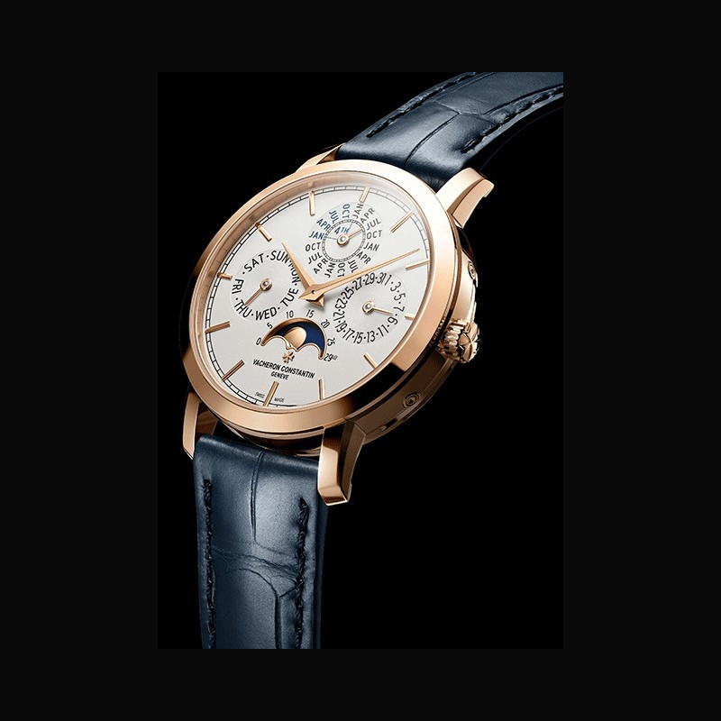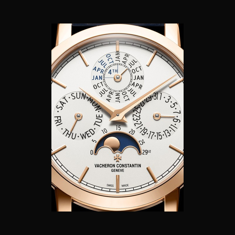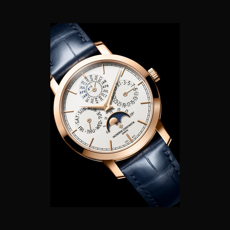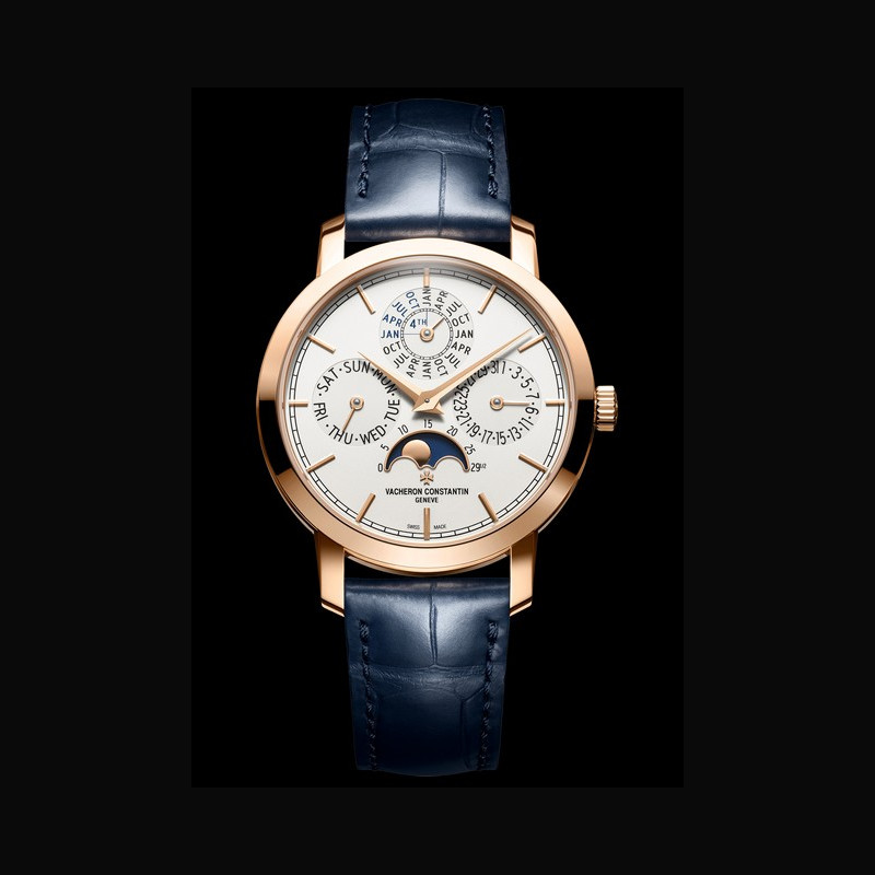 | More characteristics : | Movement Calibre 1120 QP Developed and crafted by Vacheron Constantin Mechanical, self-winding 29.6 mm (12 ½’’’) in diameter, 4.05 mm thick Approximately 40-hour power reserve 2.75 Hz (19,800 vibrations/hour) 276 components 36 jewels Case 18K pink gold Dial Silver-toned opaline Strap / Buckles Light Dark blue Mississippiensis alligator leather with tone-on-tone stitching Buckle 18K 5N pink gold pin buckle Hallmark of Geneva certified timepiece 270th Anniversary emblem on pieces produced in 2025 |