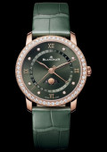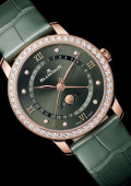 | More characteristics : | Movement Caliber 913QL.P Thickness 4.65 mm Diameter 23.70 mm Power-reserve (hours) 40 Jewels 20 Components 246 Calendar Moon Phases Calendar Secured movement Automatic Case 18ct red gold Circled by 1 row of diamonds Interhorn space 18.00 mm Dial Sunburst green dial set with diamonds Strap Alligator |