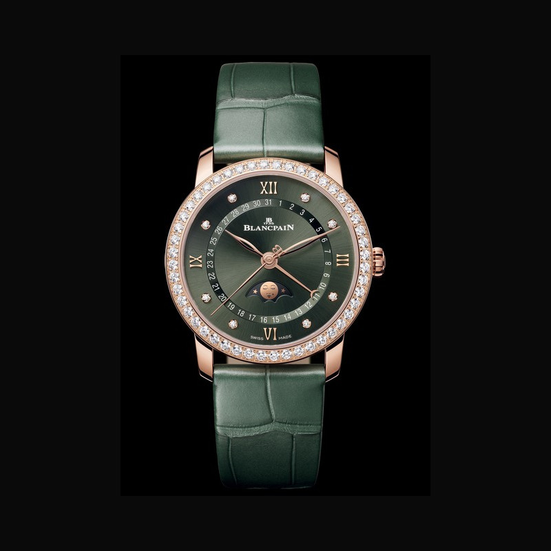 Harmoniously associating a complete calendar with a moon-phase display, the Villeret Quantième Complet is a mechanical marvel. This 40 mm 18 ct red gold timepiece indicating the date, day of the week and month through a date ring and two dedicated apertures is carefully proportioned to ensure optimum visual balance and reading comfort. The contrast between the new dial in a subtle shade of green and the red gold hands and hour-markers makes the information even easier to read, while adding unique warmth. To protect the complex calendar mechanism, Calibre 6654 is secured so as to enable the wearer to adjust the calendar indications whenever they wish, using Blancpain's patented under-lug correctors that can be operated simply at the press of a finger.
