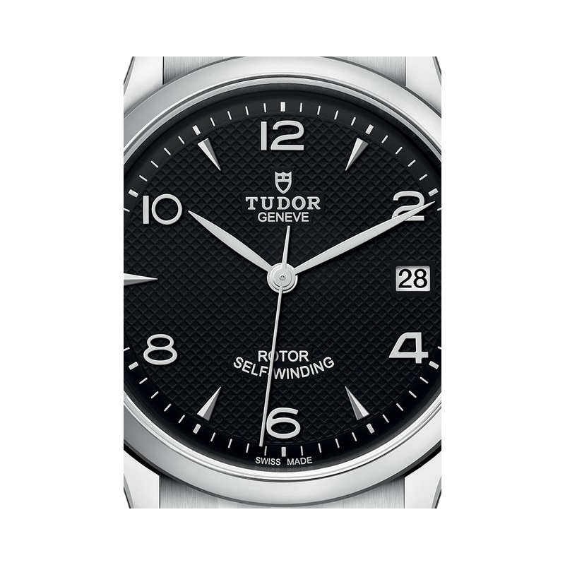 The dials of the 1926 model are a fine example of TUDOR’S thorough attention to detail. Domed for a vintage touch and adorned at the centre, their delicately embossed design harkens back to TUDOR’s origins, in subtle contrast to the smooth minute scale. Offered in a choice of silver, opaline or black, these dials have appliqued even-numbered Arabic numerals between faceted arrowshaped hour markers. There are also versions where the odd-numbered hour markers are set with diamonds. The wealth of detail of the dials of the 1926 line creates a striking and intricate play of light that perfectly complements the sword shaped hands with their matching colours perfectly.