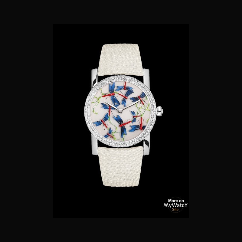 | + More characteristics : | MOVEMENT Oscillating weight bestiary design engraved Power-reserve: 40h 20 Jewels Fequency 28 800 vph CASE 18K rhodium-plated white gold Top set with 2 rows of 152 brilliant-cut diamonds (0.89ct) DIAL Ivory back-painted sapphire glass hand-made miniature painted dragonfly and ribbon patterns on top BRACELET Gros-grain satin pin buckle in white gold set with 63 brilliant-cut diamonds (0.20ct) Additional black semi-matt alligator strap TOTAL: 216 diamonds – 1.23ct |