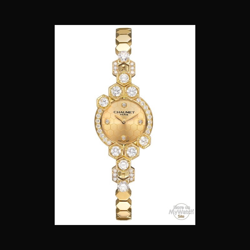 | + More characteristics : | 18K 3N Yellow gold Case and attachments in yellow gold set with 38 brilliant-cut diamonds (2.07 cts) Dial in sunburst satin-brushed yellow gold with honeycomb motif 4 honeycomb hour markers in yellow gold set with 4 diamonds (0.034 ct) Jaw clasp in yellow gold set with 7 brilliant-cut diamonds (0.3 ct) |