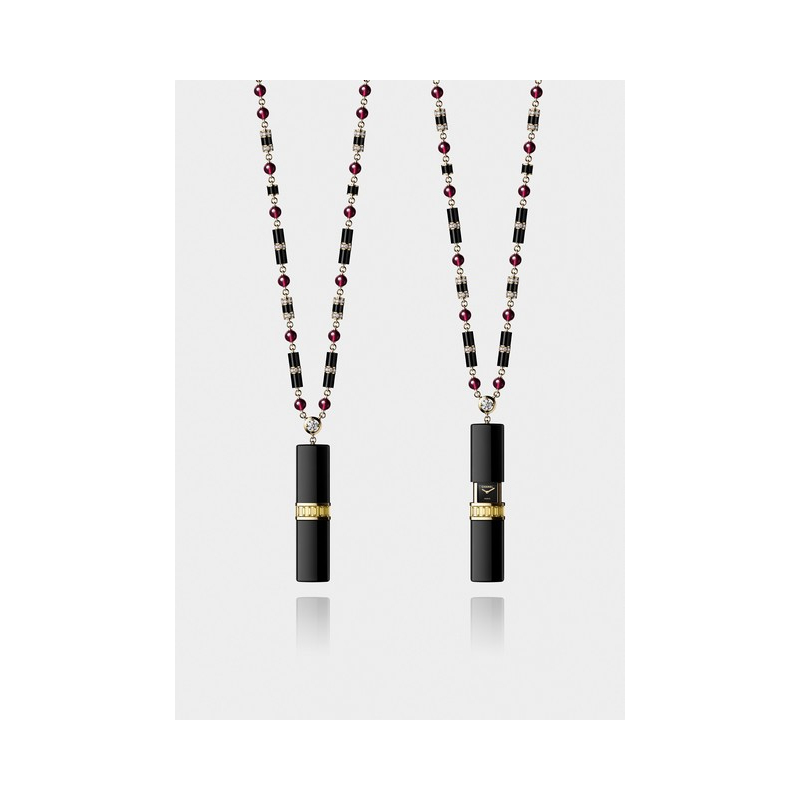 Inspired by the iconic lipstick that CHANEL created in 1954, the SECRET WATCH “KISS ME” transforms this everyday beauty essential into an exceptional jewel. In glossy black titanium, the curved square tube conceals a precious black lacquered dial that rests on a luminous ring in yellow gold, set with golden beryls. The design of this piece and its ease of opening make this faux lipstick deceptively realistic. This edition is suspended from a yellow gold chain, accented with mini onyx tubes and rhodolite beads and adorned with a central 0.70 carat diamond.