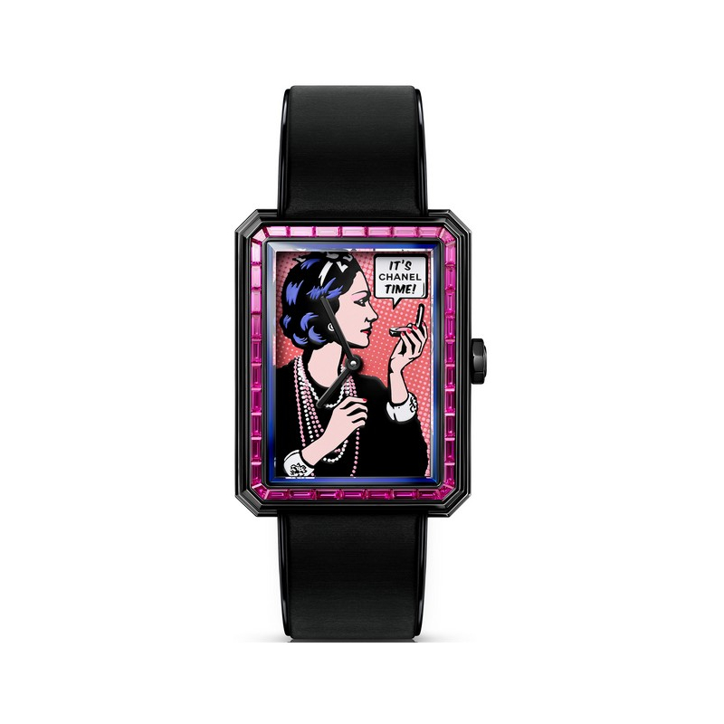 CHANEL time is inscribed in full on the dial of the BOY·FRIEND “COCO ART” watch, where Mademoiselle looks at her reflection in the mirror of her powder compact case. On a Pop Art style background, Gabrielle Chanel’s image is depicted using the tampography technique: twelve successive prints that have been stamped manually onto the white gold dial. The vibrant colors of this portrait, whose pink background is obtained through Grand Feu enamel, are perfectly represented by Les Cadraniers de Genève*. Chosen for their radiance and the vivacity of their pink hue, 38 baguette-cut sapphires are set on the bezel to illuminate Coco Chanel’s profile.
